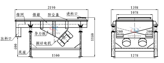 該產品為1000mm(寬)x2000mm(長)一層兩個出料口碳鋼材質鐵質網架結構直線振動篩篩。