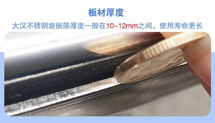 不銹鋼旋振篩說的是整機或與物料接觸部位為304不銹鋼材質,有的廠家為了降低生產成本,將其板材厚度降低至4mm以下,雖然其價格會比較便宜,但是在后續使用過程中就會出現篩框斷裂、壽命降低等問題,所以選擇不銹鋼旋振篩時請先查看板材厚度是否合格,大漢不銹鋼旋振篩厚度一般在10-12mm之間,使用壽命更長。